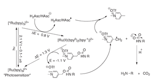 R: Prendendo come esempio la reazione di fotodegradazione, inferiamo il suo processo di reazione, dove il bipiridina di rutenio agisce come ossidante e l’acido ascorbico come riducente.