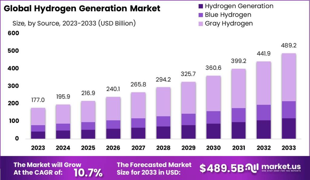 Laut GLOBE NEWSWIRE (Market.us) vom 9. Januar 2024 erreichte der Wasserstoffproduktionsmarkt im Jahr 2023 einen Wert von 177 Milliarden US-Dollar und wird voraussichtlich stark wachsen, bis 2033 einen Wert von 489,2 Milliarden US-Dollar zu erreichen. Von 2024 bis 2033 wird erwartet, dass dieser Markt die höchste durchschnittliche jährliche Wachstumsrate (CAGR) von 10,7 % erfahren wird. Der Wasserstoffmarkt umfasst hier die Branchen, die sich mit der Produktion, Speicherung und Verteilung von Wasserstoff beschäftigen.